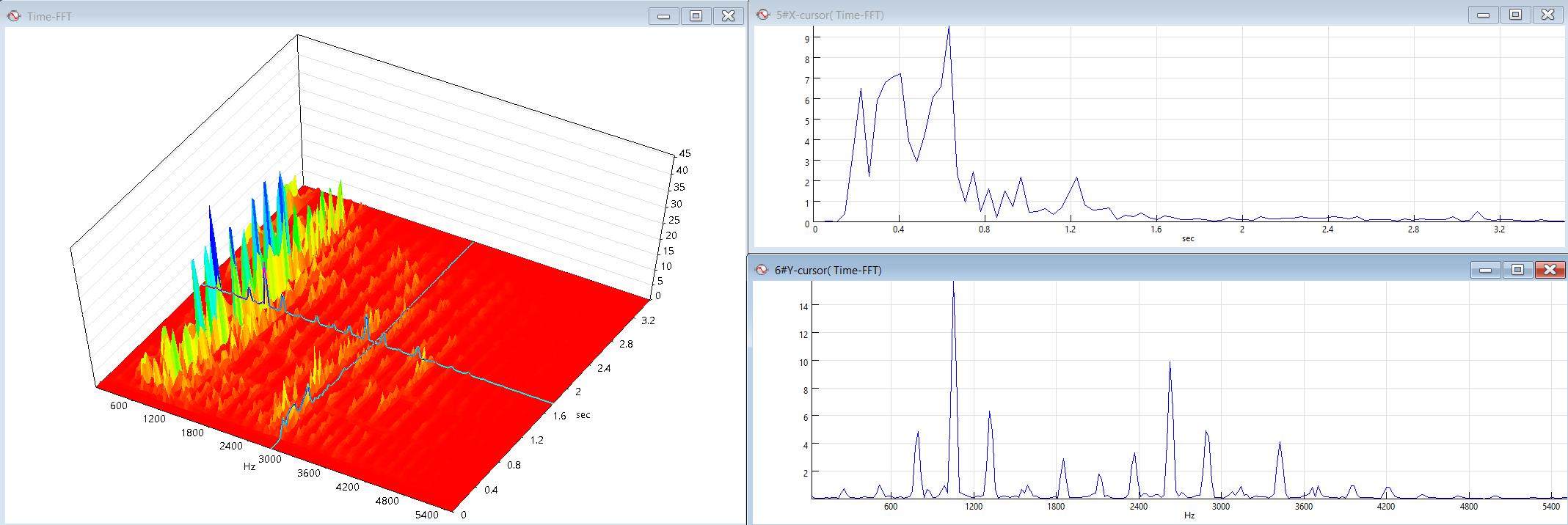 In SIGVIEW, you can extract a cross-section of data from a 3D graphic and view it as a standard 2D signal. This is particularly useful for analyzing how a specific frequency component evolves over time, for example, by extracting all values at a fixed frequency from a time-frequency (FFT) spectrogram.