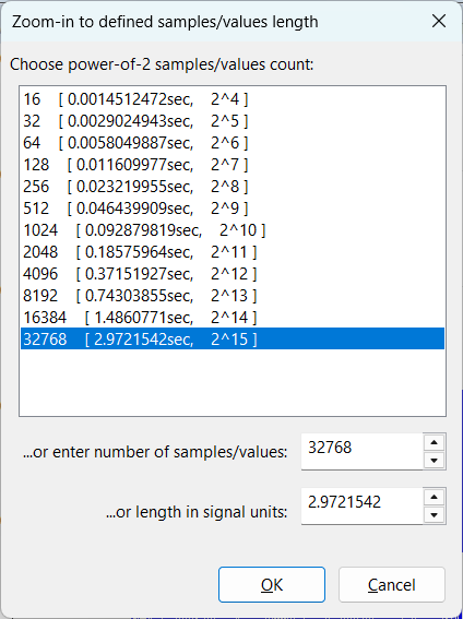 Zooming signal to arbitrary length: It is often useful to zoom in on a signal to a part with exact length (in samples or values). Furthermore, for FFT-based calculations, it is often useful to choose a signal length equal to a power-of-2 number of samples. It will have great effect on FFT computation speed and precision. You can do both by pressing the button on the toolbar or choosing Edit/Zoom to X samples/values in the main menu. A dialog will appear with all possible power-of-2 lengths that your signal can be zoomed into. Choose the desired length end press OK. You can also use this option to zoom in to some arbitrary, non-power-of-2 signal length or a signal length in signal units. Simply enter the desired length in the corresponding edit-box.