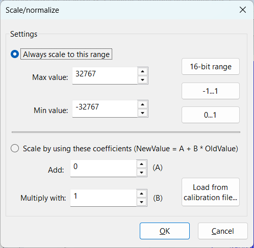 Accessible through the “Signal tools/Scale/Normalize” menu option or the toolbar button.