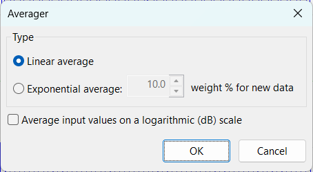 - Average input values on a logarithmic (dB) scale: Enable this option if the input signal already contains logarithmic (e.g. dB) values. The Averager will then perform averaging correctly in the linear domain internally and convert the result back to the log scale, instead of simply averaging the log values numerically.