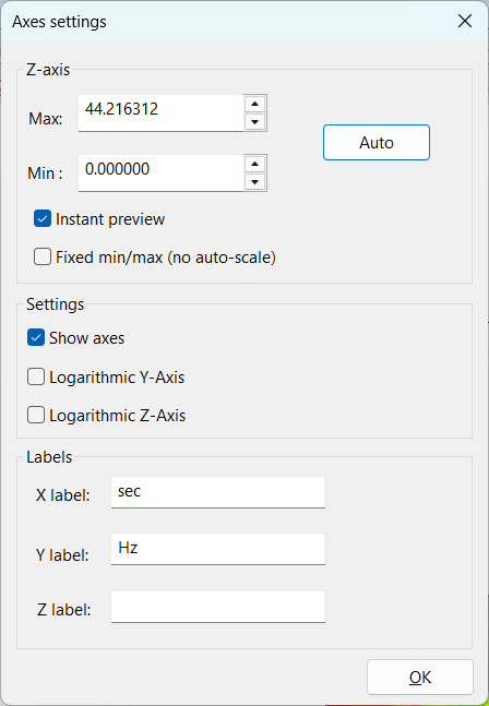 - The X label, Y label, and Z label fields define the text shown beside each axis when Show axes is selected (for example, sec, Hz, or Amplitude).