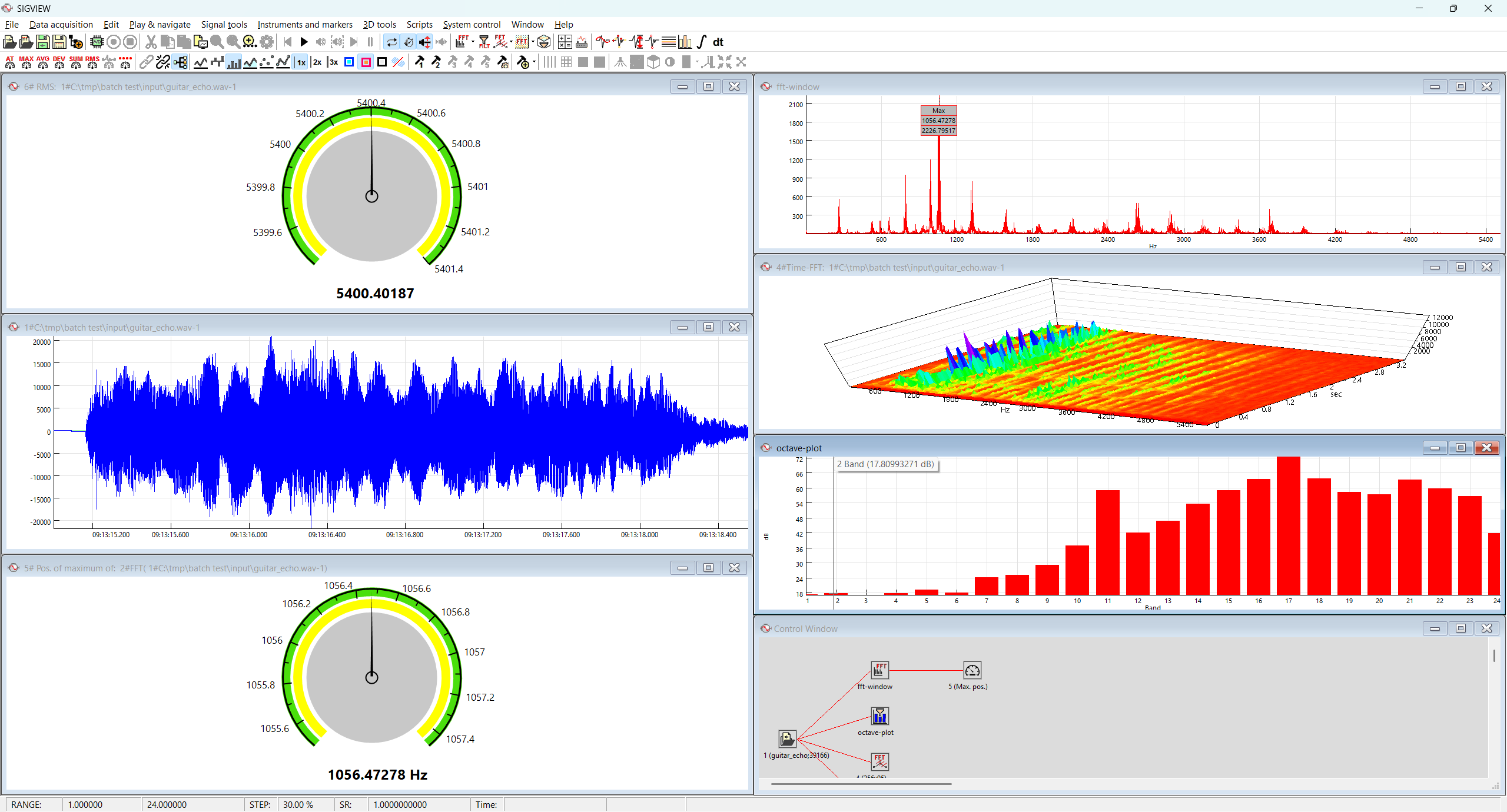 - Create a template/example Workspace: Start by creating template workspace that defines all your desired analysis steps for a typical input file. Make sure that all analysis windows you need are created and all needed results are visible. For example, we will create a Workspace which calculates a spectrum (FFT-Window), a 1/3 Octave plot, Time-FFT plot, and also two instruments calculating RMS of the signal and a maximal frequency position from its spectrum. This workspace will be used as a template analysis which will be applied to all signal files during later automated processing.