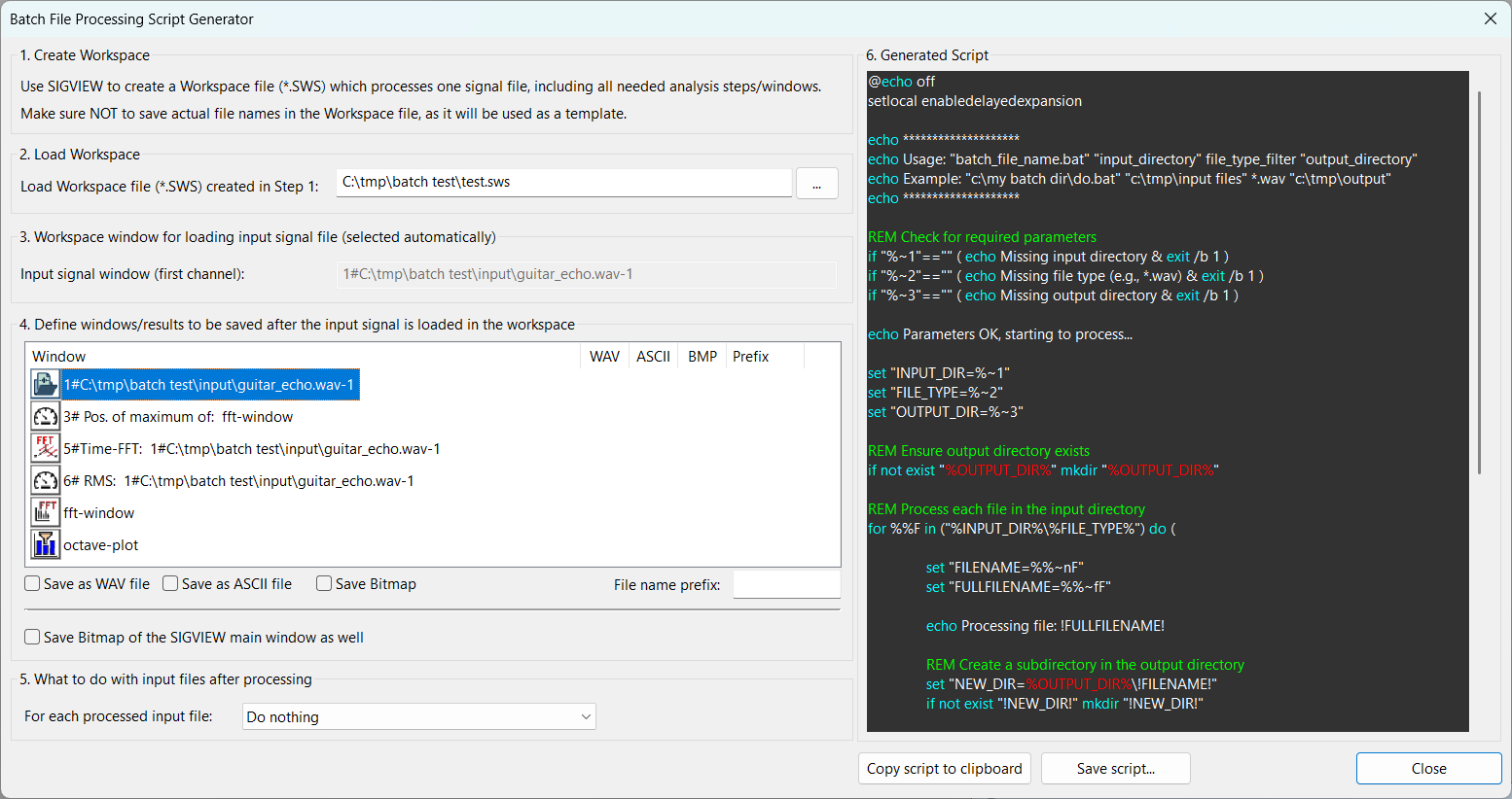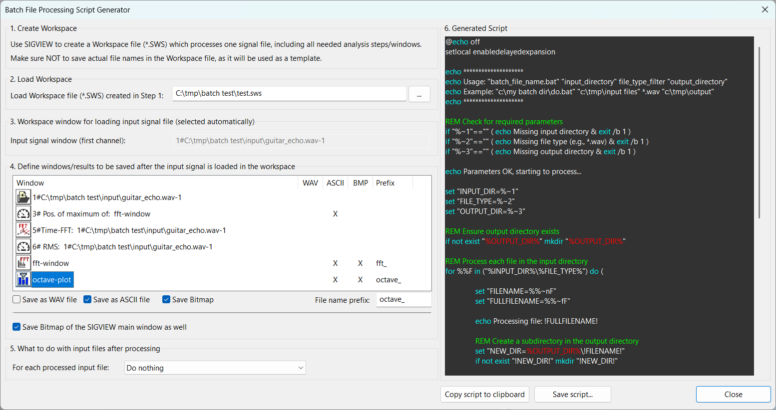 To simplify this process, SIGVIEW includes a Batch File Script Generator, which allows users to create ready-to-run batch files for automated signal processing - without needing to write any code.