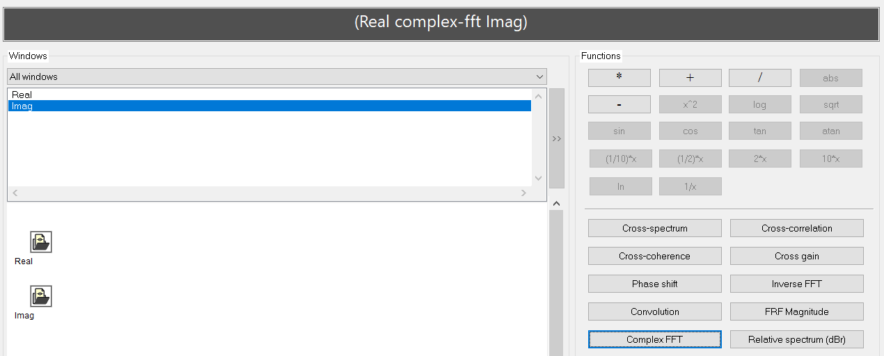 Before applying this function, you need to load both the real and complex part of your signal as separate signal windows in SIGVIEW. Alternatively, you can perform 2-channel data acquisition whereby the first channel contains real values and the second one complex values. Afterwards, simply open the “Signal calculator” window, choose real signal component, then press the “Complex FFT” button, and then finally choose your imaginary signal component. The result should look like this: