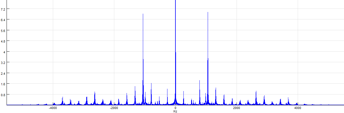Press the OK button in the “Signal Calculator” dialog and a new window containing complex FFT will appear. As expected, its frequency axis will contain both negative and positive frequencies.
