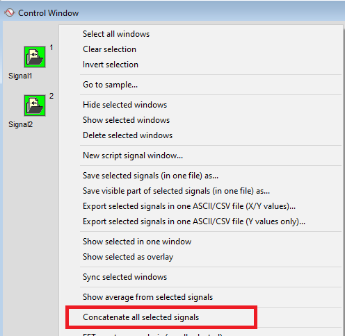 To concatenate multiple signals into one signal, you can use the corresponding function in the Control Window (see also Control Window basics).