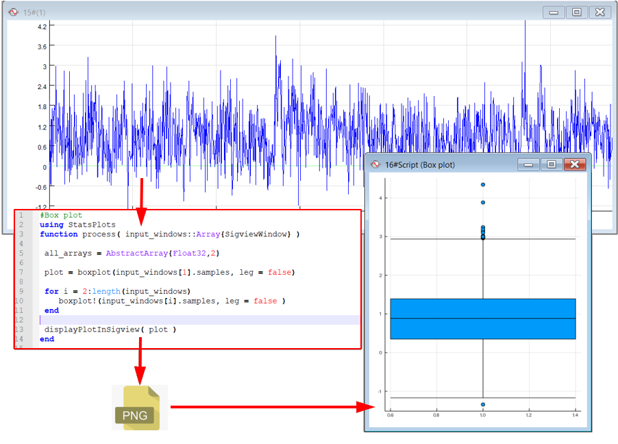 Let's show how this works on an example. We will use a boxplot function of a StatsPlots module to generate a display a Box-Plot from the input signal (parameter checking omitted for simplicity):