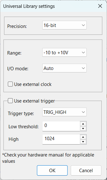 Regarding other, low-level parameters, please consult online help for the corresponding Measurement Computing API: