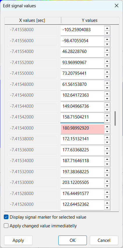 When this option is enabled, a signal marker is displayed in the underlying signal window at the position of the value currently focused in the dialog table. This makes it easy to visually track which sample you are editing. - Apply changed value immediately