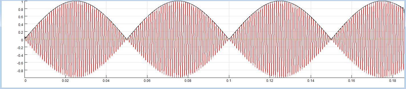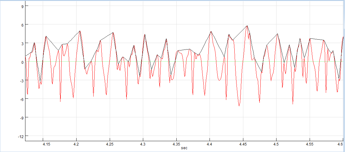 The following example shows the original signal (red) with an overlay (black) calculated by using this tool.