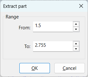Edit/Extract signal part (from-to) option from the menu. A dialog appears where you define limits of the part you want to extract (the units are the same as X-axis units of a signal). A new window with the extracted part of the signal will appear. It will always contain part of the origin signal (for example, 1000-2000Hz part from FFT sequence) that you defined in the Extract dialog. It is useful for extraction of one part of the spectrum in a separate window. You can use it to observe several frequency ranges in separate windows and calculate their statistics values.