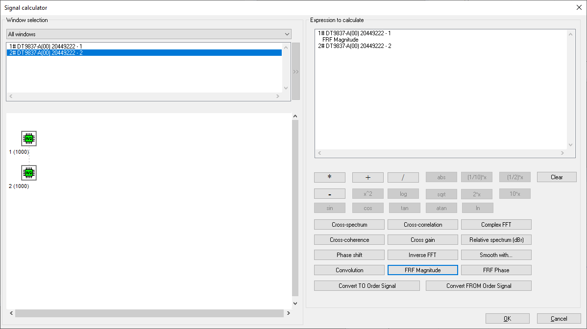 2. As a next step, before starting any acquisition, create any calculation windows needed for your analysis. Typically, you would use FRF magnitude and phase. Both functions can be found in the Signal Calculator. Here is an example for adding FRF Magnitude: