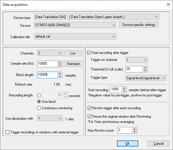 We will use 2 channels (one for hammer and one for other accelerometer) at the sampling rate of 10kHz. The recording will be started after a trigger (20% of full range) on channel 1 (impact channel). We will start recording 1000 samples (100ms) before the trigger. Only one block of data (10000 samples = 1s) will be recorded after each trigger. After that, the trigger will be re-armed, and the next recording will be done in the same window. We will do this 2 times, which will result in total of 3 blocks being recorded.