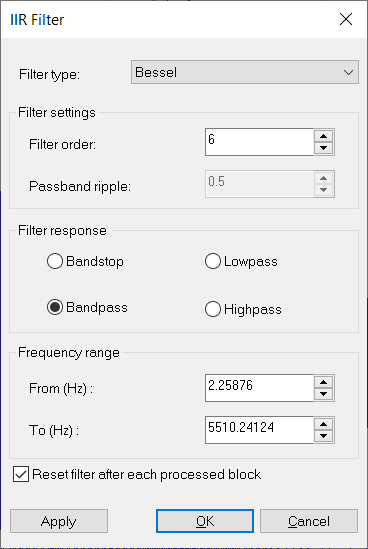 The "Reset filter after each processed block" setting controls whether a fresh filter is applied to every new block of signal or if the signal processing continues with the existing state after a block is completed. Deactivate this feature if your signal is continuous, meaning all the blocks being processed are sequential.
