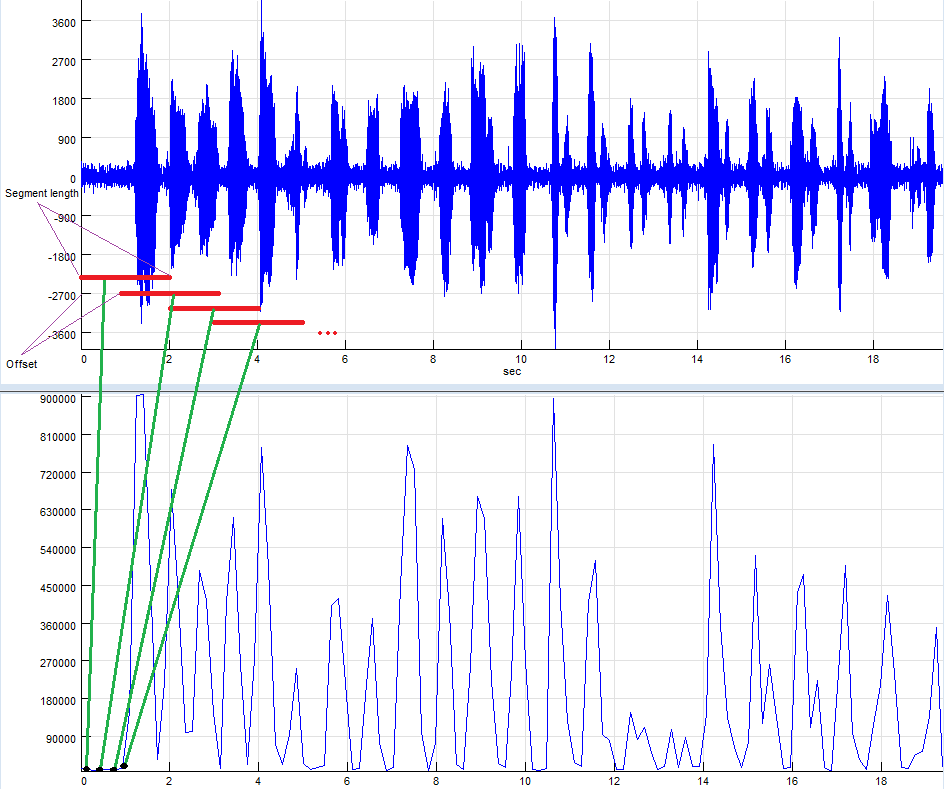 After pressing OK, the calculation procedure will be started. It will divide a visible part of the input signal into segments of a defined length. Each new segment will be shifted relative to the previous segment by using a defined offset (step) value. All calculated values will be the same as if the corresponding instrument function was used on a corresponding signal segment.