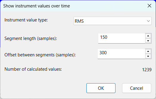 As a next step, you must enter a segment length in samples for the calculation of a single instrument value, and an offset in samples between each consecutive segments. At the bottom of the dialog, a resulting number of values for your current segment/offset settings will be displayed.