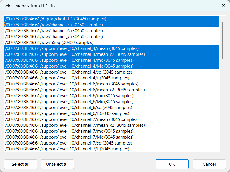 The software scans the file and detects all datasets that represent signal-like sequences.