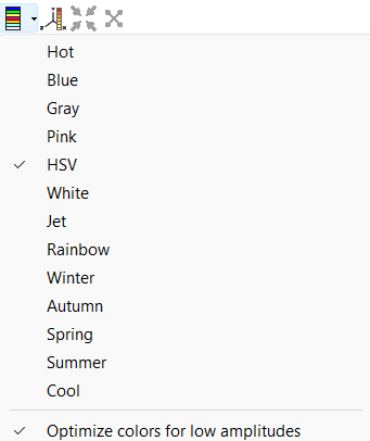 The "Color optimization for low amplitudes" option, available from the palette menu, provides an additional enhancement for spectrum-based visualizations: