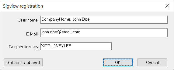 If your registration was successful, your registration data will be shown in the SIGVIEW About box (Help/About… in menu).