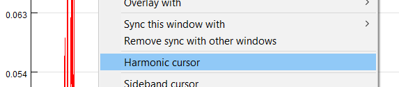 By turning the Harmonic cursor option on in the context menu of FFT-based and signal calculator windows, a cursor will be shown on the current position of the mouse cursor as well as on all harmonics of the current frequency (current frequency x2, x3, x4, etc.)