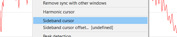 Sideband cursor function displays additional cursors at defined offset frequencies to both side of the base cursor. Sideband cursors are displayed at multiples of a fixed offset/distance from the base signal cursor. You can turn sideband cursor on or off by using by using a context menu option: