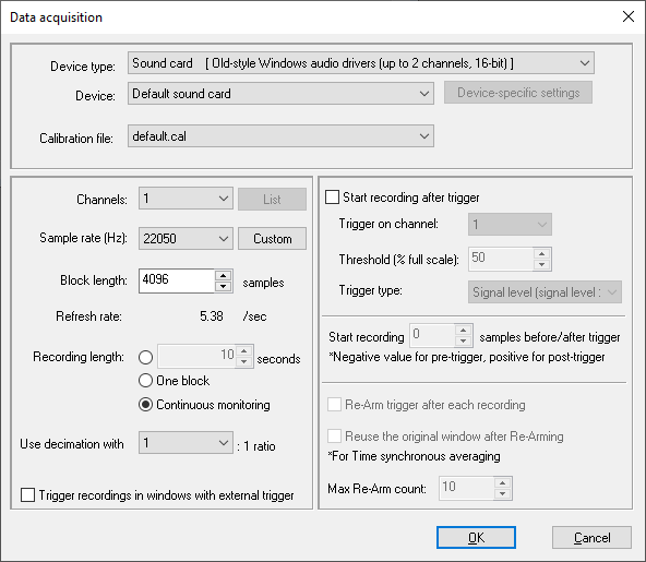 1. Let us take a sound card device as an example. You can connect some signal source to it before you start (microphone). Open the "Data acquisition" dialog ("Data Acquisition/Open data acquisition" menu item), choose "Sound card" or “DirectSound” as device type and your sound card name as "Device". Leave all other default settings. Click OK and the data acquisition signal window will open.