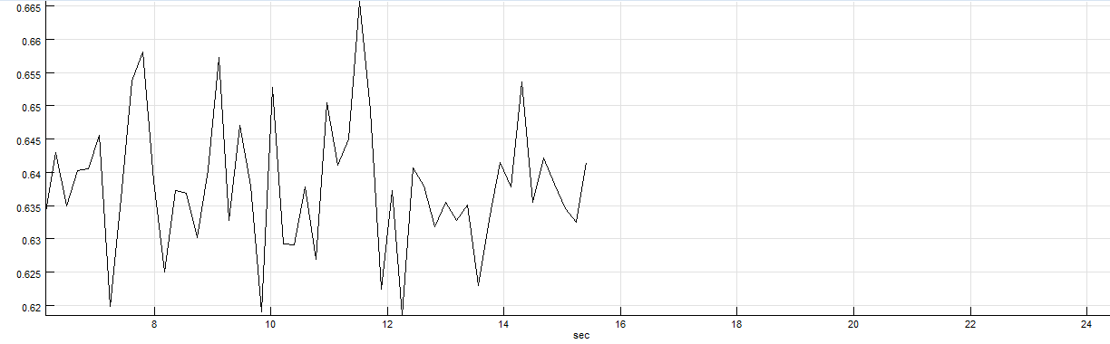 6. After 100 changes (remember your setting for buffer length), log windows will be full, and the display will start scrolling. You can use the context menu to reset data (i.e. start from the beginning) or to stop/start logging. The value log signal will try to automatically determine values for its X-axis by backtracking through the analysis chain. If those X values are equidistant (i.e. the difference between two consecutive values is always the same), those will be displayed on the X-axis. If not, the X-axis will switch to a unit called "change" where each new value will simply be labelled with its index, i.e. 0,1,2,3,4...